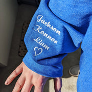 Take your style to new heights with our Custom Embroidered Noni Sweatshirt! Featuring your kids' names on the sleeve, this sweatshirt is a unique and bold addition to your wardrobe. Perfect for the risk-taker who loves to make a statement. Turn heads and show off your love for your kids at the same time!