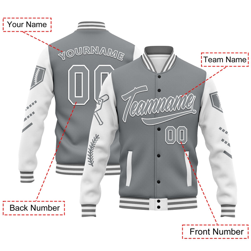 Push the boundaries and stand out from the crowd with our Custom Grey White Letterman Two-Tone Jacket. Made with top-quality materials and a daring color combination, this jacket will keep you warm while making a bold statement. Show off your unique style and embrace the thrill of taking risks with this one-of-a-kind jacket.