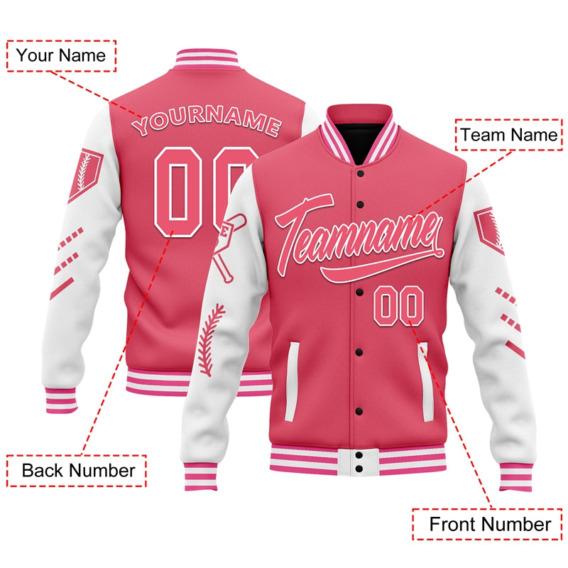 Ready to make a bold statement? Get ready to turn heads with this custom rose pink and white letterman jacket. Perfect for those who love to take risks and stand out in a crowd. Showcase your unique style and make a statement with this two-tone jacket.