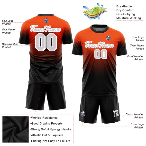 Expertly crafted for the modern soccer player, the Custom Orange-Black Sublimation Soccer Uniform Jersey is designed to provide maximum comfort and performance on the field. With its unique sublimation technology, this jersey offers vibrant colors and long-lasting durability. Show off your team's style and stand out on the pitch with this custom jersey.