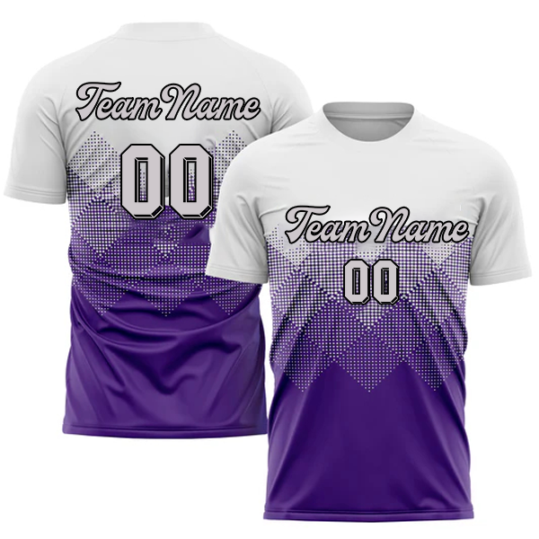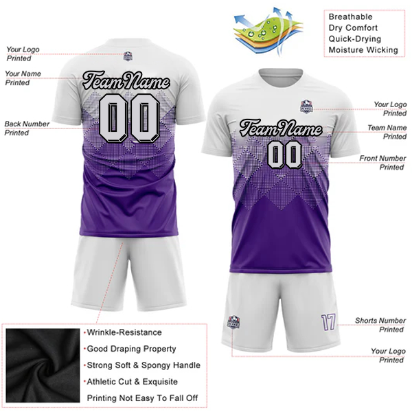 Stand out on the field with this Custom Purple-White Sublimation Fade Fashion Soccer Uniform Jersey. Dominate in style and comfort with its unique design and personalized fit. Take risks and make a statement with this bold and inspiring jersey.